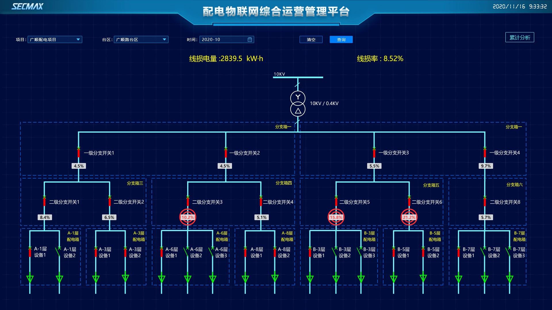 拓撲圖展示臺區線損情況以及線損超標報警。