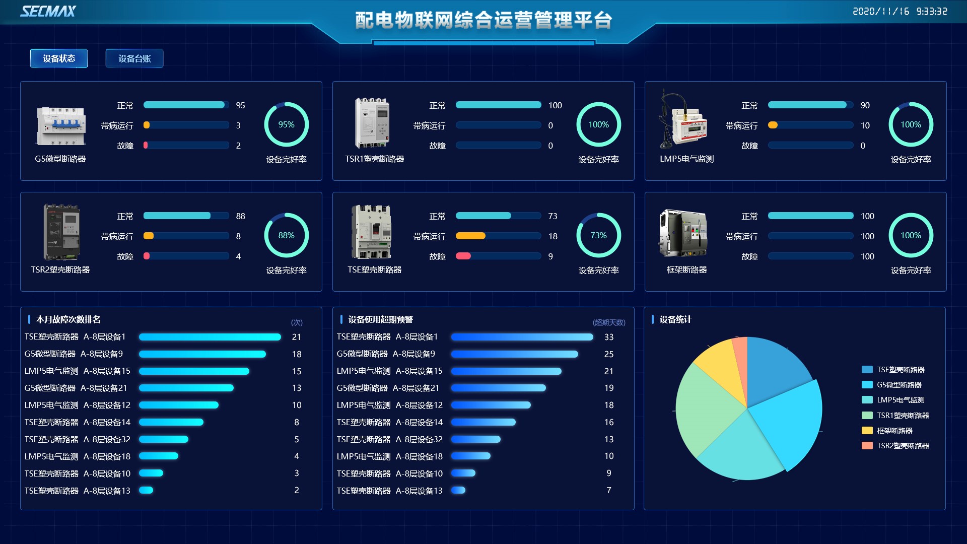 展示各類設備運行狀態、設備故障次數排名、設備使用超期預警。