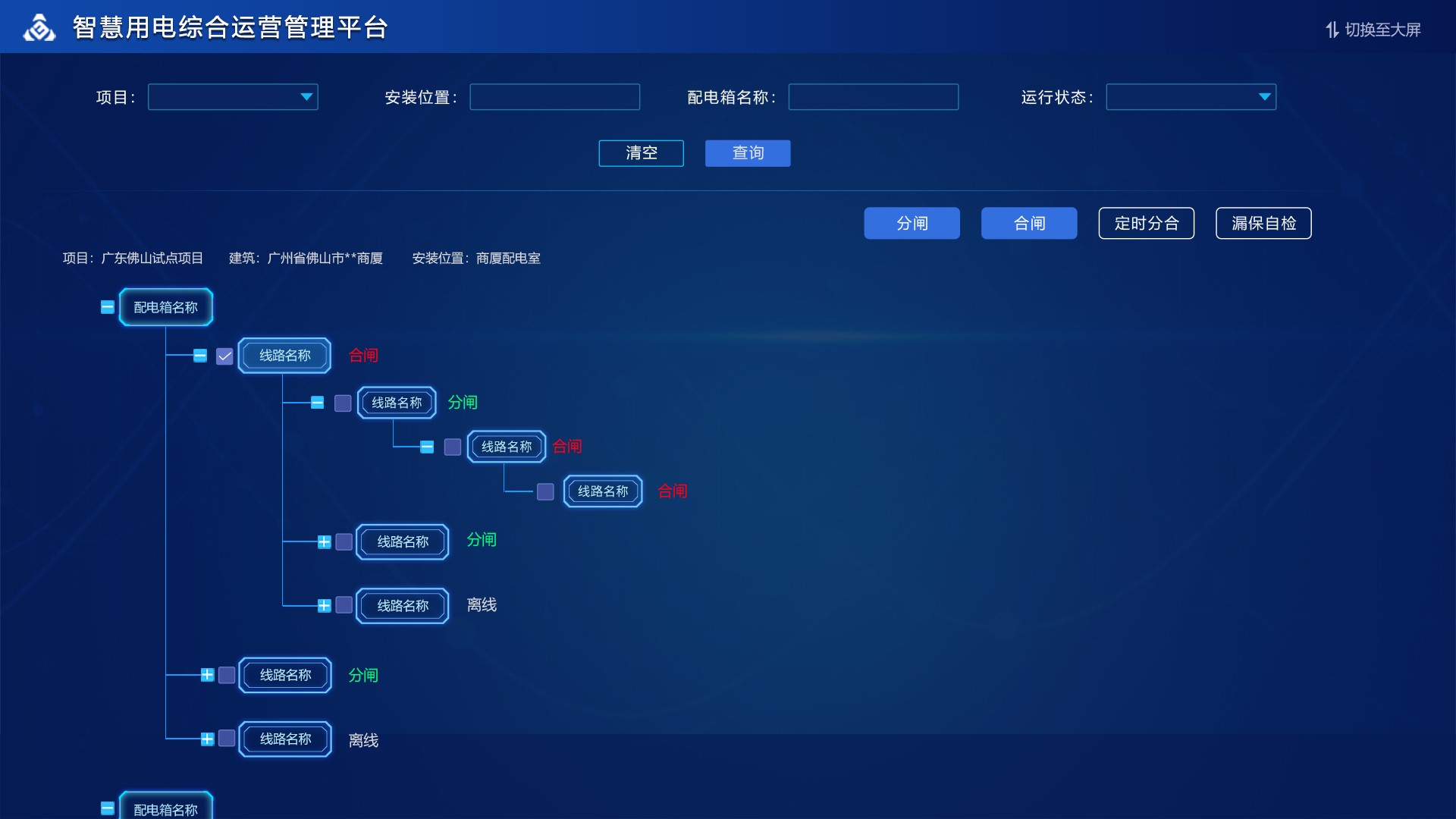安裝的設備通過數據層級圖有一個直接的分布情況展示,并可做查看詳情,查看電氣參數以及指定分合閘操作。