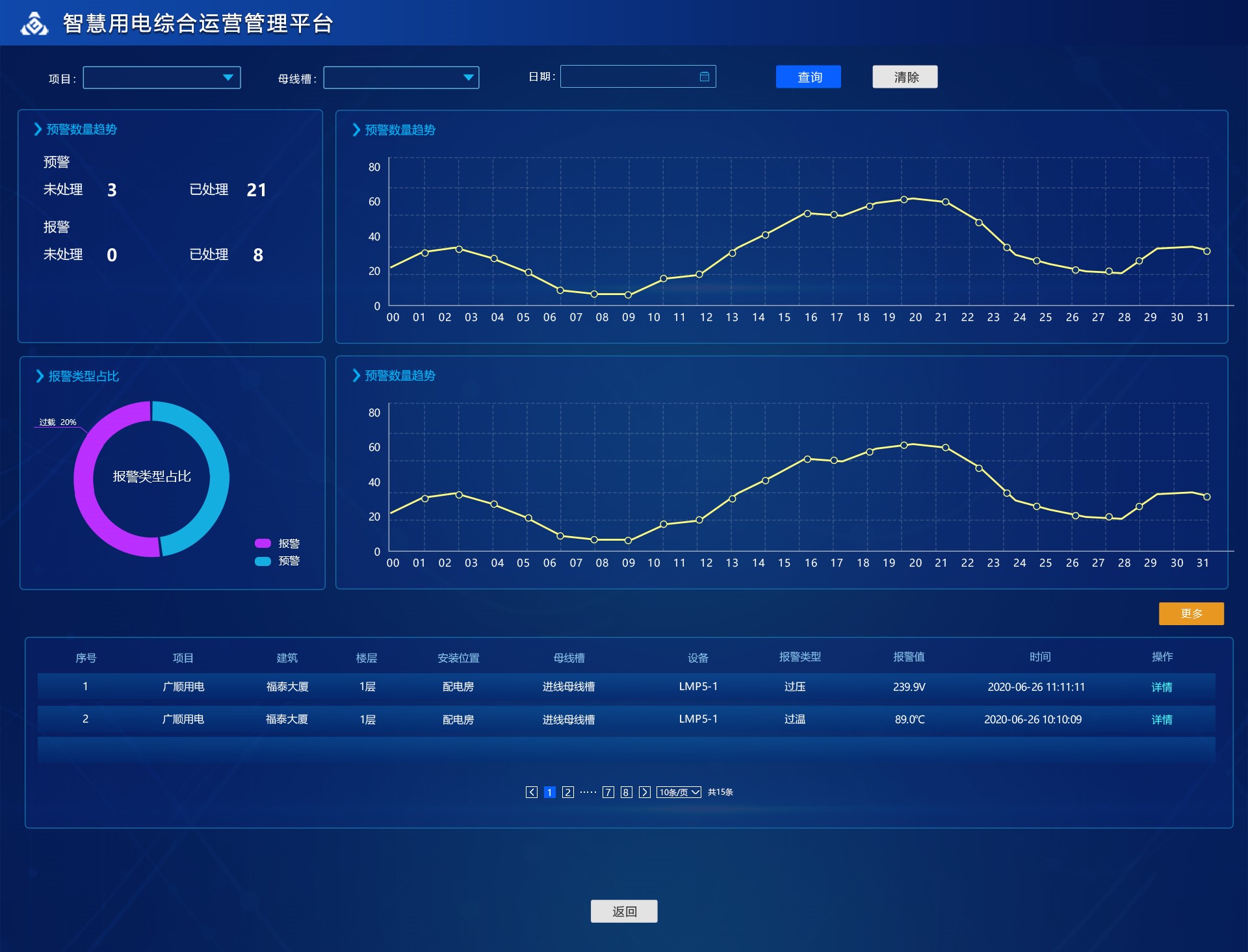 頁面展示報警相關統計圖表以及最新報警數據。